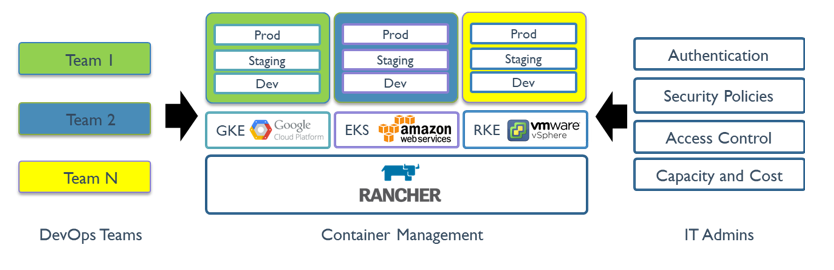 下图讲述了 Rancher 在 IT 管理团队和 DevOps 开发团队之间扮演的角色。DevOps 团队把应用部署在选择的公有云或私有云上。IT 管理员负责查看并管理用户、集群、云服务的权限。