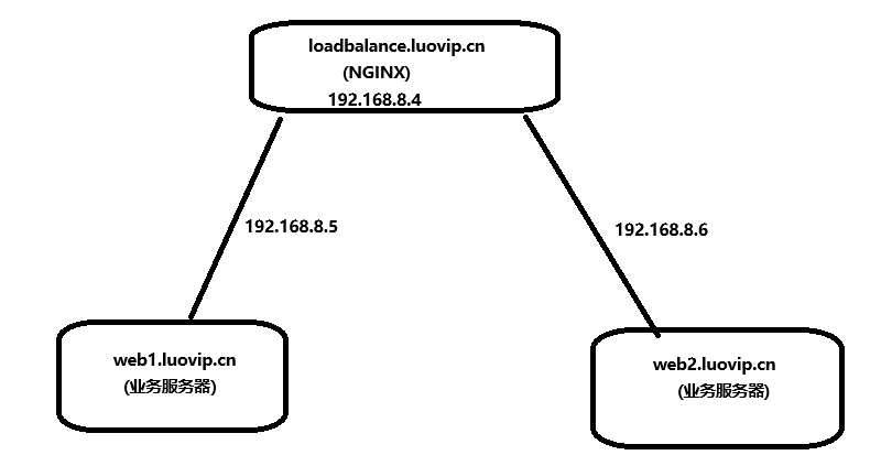 在这个架构中,NGINX负载均衡器loadbalance.luovip.cn(IP地址192.168.8.4)负责将请求分发到两台普通业务服务器web1.luovip.cn(IP地址192.168.8.5)和web2.luovip.cn(IP地址192.168.8.6)