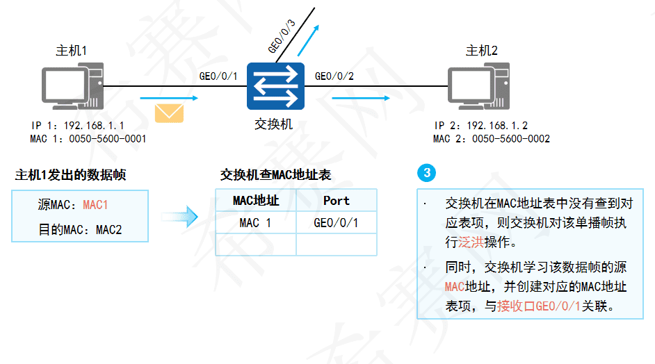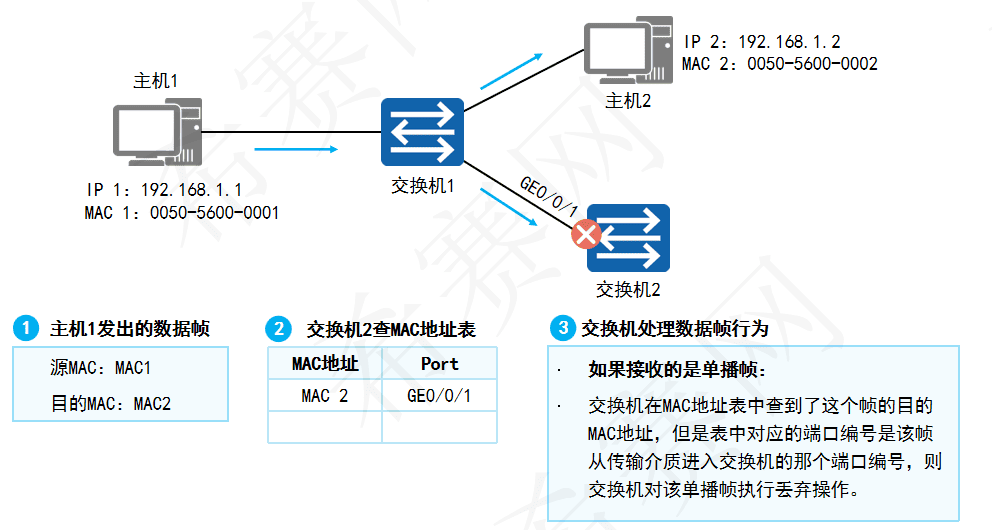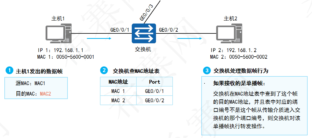 在收到数据帧后,交换机学习帧的源MAC地址,然后在MAC地址表中查询该帧的目的MAC地址(本例中MAC2:0050-5600-0002),并将帧从对应的端口转发出去。
