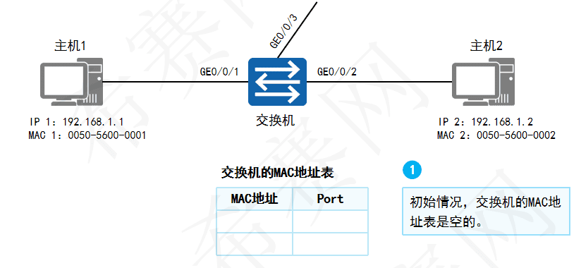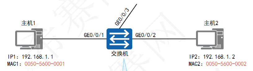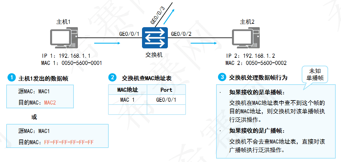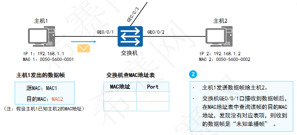 2.主机1发送数据帧给主机2,交换机GE0/0/1口接收到数据帧后,在MAC地址表中查询该帧的目的MAC地址,发现没有对应表项,则收到的数据帧是”未知单播帧”。