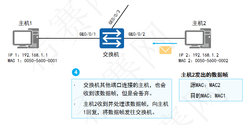 4.交换机其他端口连接的主机,也会收到该数据帧,但是会丢弃。主机2收到并处理该数据帧,向主机1回复,将数据帧发往交换机。