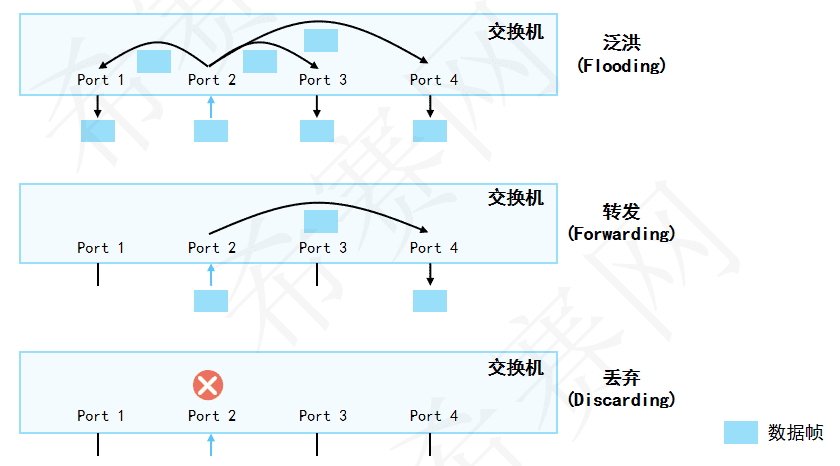 交换机对于从传输介质进入某一端口的帧的处理行为一共有3种: