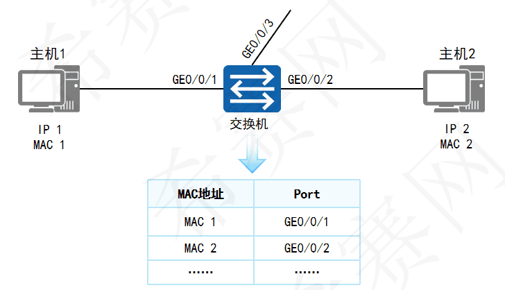每台交换机中都有一个MAC地址表,存放了MAC地址与交换机端口编号之间的映射关系。