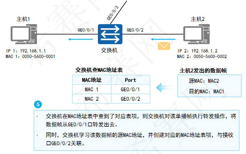 5.交换机在MAC地址表中查到了对应表项,则交换机对该单播帧执行转发操作,将数据帧从GE0/0/1口转发出去。同时,交换机学习该数据帧的源MAC地址,并创建对应的MAC地址表项,与接收口GE0/0/2关联。