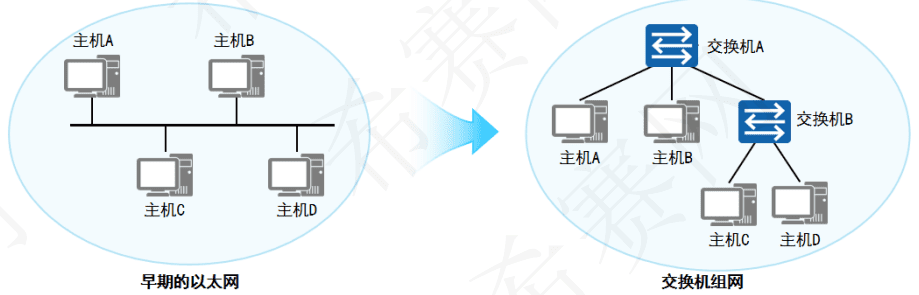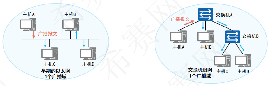 在传统的以太网中,同一介质上的多个节点共享链路,一台设备发出的广播报文,所有设备均会收到。
