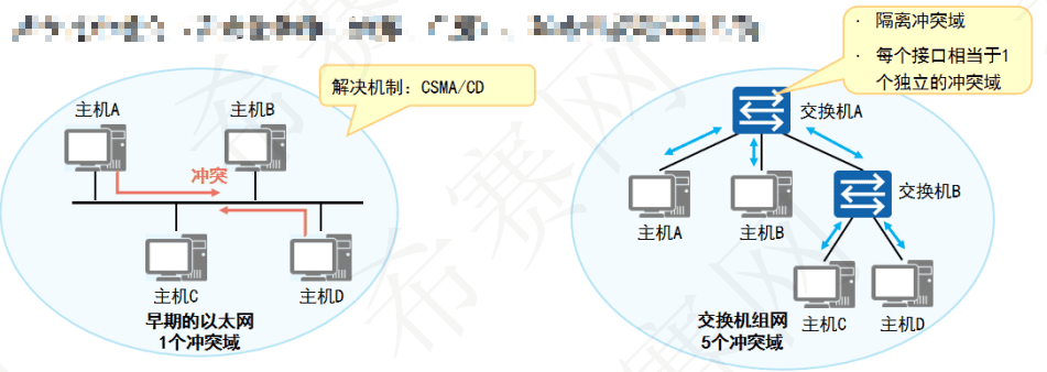 在传统的以太网中,同一介质上的多个节点共享链路带宽,争用链路的使用权,这样就会发生冲突。