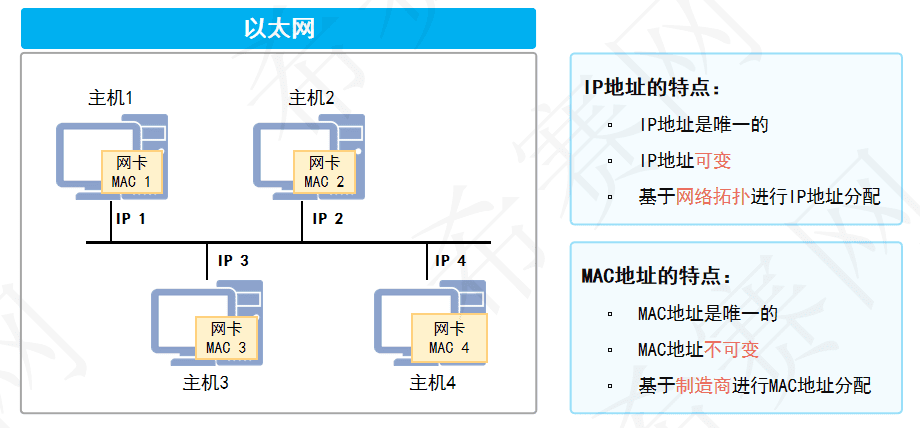 每个以太网设备出厂时都有唯一的MAC地址,但在设备接入网络时,会同时为每台主机再分配一个IP地址。